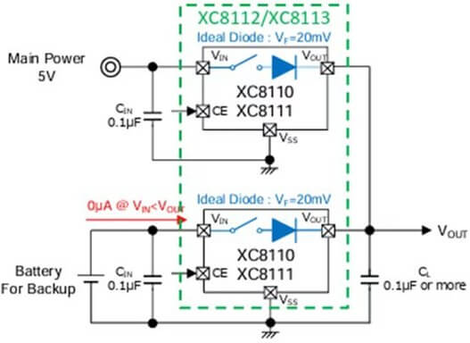 对于需要备用电源或多电源供电的系统,确保电源轨之间的无缝切换至关重要,需要对电路进行优先级设置。传统的肖特基二极管(SBD)基准的OR连接电路存在诸多问题,包括较大的正压降(VF)损耗、反向漏电流以及因电压降导致的不稳定运行,肖特基二极管产生的发热与功率损耗增加,这些问题都会降低效率并缩短电池寿命。使用 MOS 进行 OR 连接的设计又太过复杂。使用多颗 XC8110 就无需复杂控制的无缝自动切换,可以通过 MCU 控制 XC8110 的 CE 引脚来实现电路的启动先后。超低的待机电流,有助于延长备用电池系统的使用寿命(参考电路如图 2)。如果对于小型化有要求并且需要两路 OR 电路的可以选择使用 XC8112/XC8113(实装电路板如图 3)来实现。